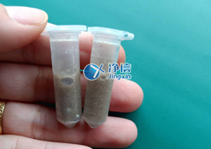 干磨:剪适量头发放入2ML离心管中,加入研磨珠若干颗,将装有样本的离心管放入研磨孔中,分布均匀摆放,若样本数量低于8个,需用空管配比均匀,间隔相同数量研磨孔摆放样品管和空管,以保证研磨过程中受力均匀,管子不被打破,离心管摆放后,盖上机器盖子,设置研磨参数,将档速调制4档,研磨时间设置为5分钟,按开始键进行研磨,干磨效果较好,基本一次就可以研磨成功