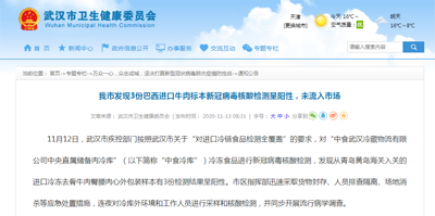 11月12日,武汉卫健委发布消息称,发现3份巴西进口牛肉标本新冠病毒核酸检测呈阳性。