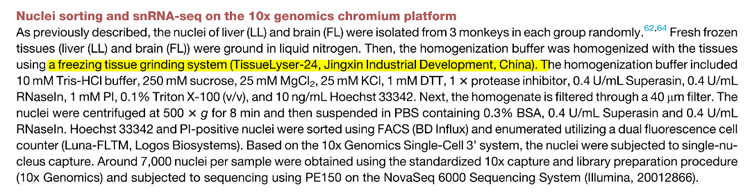 Tissuelyser-24L发挥了不可或缺的作用。研究团队利用这种净信的组织研磨仪,从雄性猕猴的肝脏和大脑中提取细胞核,为后续的单细胞RNA测序(snRNA-seq)分析奠定了基础。通过精确的细胞核分离和高质量的样本制备,研究人员能够深入探究二甲双胍对细胞老化的具体影响,从而揭示了其在延缓衰老中的分子机制。
