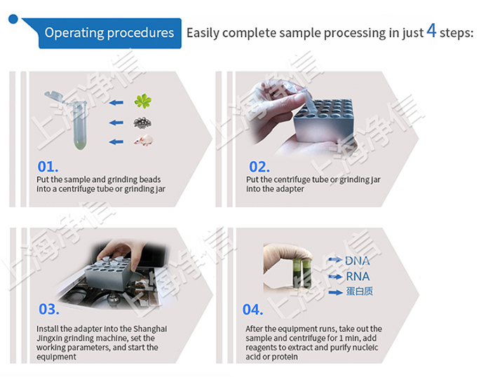 The sample tube is in a fully enclosed state during the crushing process, and disposable centrifuge tubes and beads can be used. The sample is kept in the tube completely to avoid cross-contamination between samples and external contamination.
