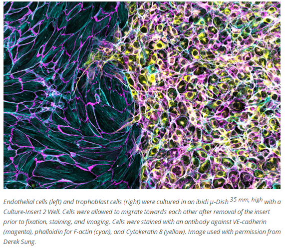 Endothelial cells cultured in a µ-Dish 35 mm, high with a Culture-Insert 2 Well. Image by Derek Sung, University of Pennsylvania School of Medicine, USA.