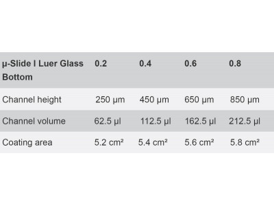 Because of the adhesive layer, the channel height of the µ-Slide I Luer Glass Bottom increases by 50 µm compared to the µ-Slide I Luer.