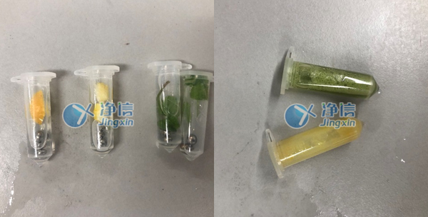上图为2分钟的研磨效果,已经完全研磨完成。效果非常好,仪器要有低温功能,因为温度对结果有影响,多样品组织研磨仪一次可以研磨16个样品,大大提高了之前用手混匀提取的效率,所以人工研磨特别不方便,经过多次了解和对比所以老师选用净信组织研磨仪代替人工处理。效率高,效果好。完美解决了老师的研磨问题。