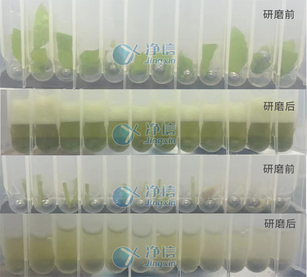 实验结果如图所示,与研磨前对比,研磨后样品呈现颜色均一,无杂质的匀浆状态,其中根、茎在大批量处理条件下也能达到均一的粉碎效果,该实验参数下获得的结果为后续研究开展提供了先决基础。