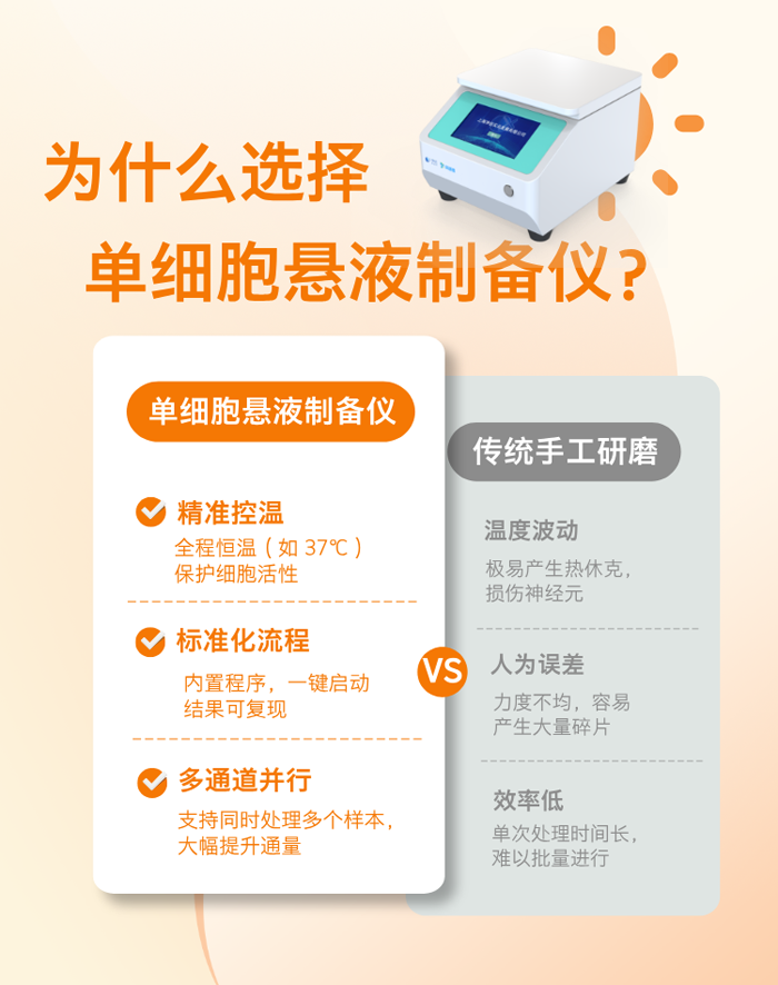 背景介绍:在神经科学研究中,小鼠脑组织的解离一直是一道“硬骨头”。传统的手工研磨不仅耗时费力,更常因机械剪切力过大或温度控制不均,导致细胞受损、活率低下。今天,我们分享一款仪器——单细胞悬液制备仪,让您的实验数据大大提升。