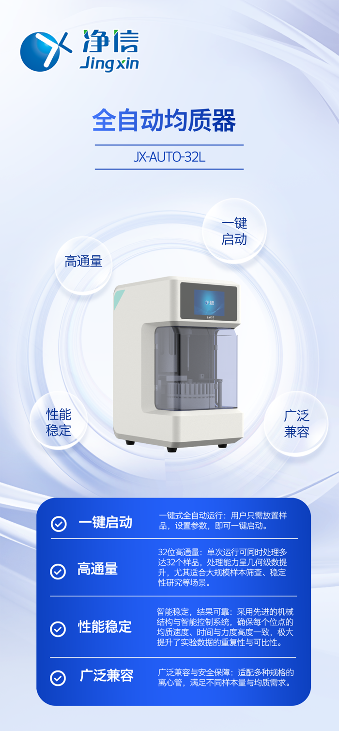 净信JXAUTO-32L全自动均质器,不仅仅是一台提升效率的设备,更是实验室迈向标准化、自动化、智能化的重要一步。它通过取代重复性人工劳动、保证数据源头的一致性、大幅提升科研产出速度,为研究人员赢得了宝贵的创新时间。在追求效率的时代,JXAUTO-32L正成为众多质量控制、研发创新实验室中不可或缺的得力助手。