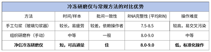 实验背景:RNA 提取成功与否,很大程度上取决于前处理阶段能否借助冷冻研磨仪快速、充分地破碎组织,同时有效抑制 RNA 酶(RNase)活性,从源头避免 RNA 降解。