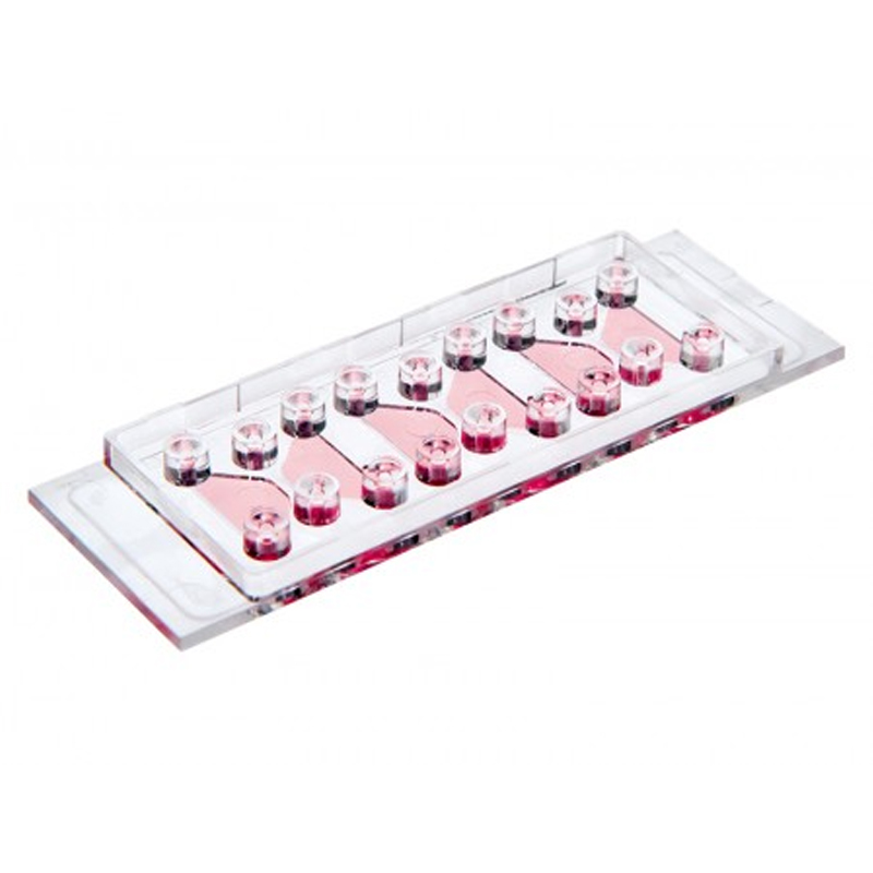 搭配微量分注器使用于两侧60 μL储液槽中制造出化学物质的线性浓度梯度,此时嵌入在储液槽中间观察管道基质胶中的细胞即处于一稳定的线性浓度梯度培养环境中。