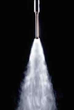 雾化的物料量可低至2 µl /秒。因为液滴通常以低速向下漂移在重力的影响下,应将探头安装时使探头的尖端朝下,并保持空气湍流。最小以减轻喷雾图案变形。低速空气和折流板可用于将喷雾夹带到特定位置区。各种涂料,化学药品,润滑剂和颗粒悬浮液都可以轻易雾化。但是,诸如粘度,混溶性和固体含量之类的因素值得考虑。为获得最佳雾化效果,粘度应 低于500 cps,固体浓度保持在30%以下。因为雾化过程取决于使液膜运动,所以通常粘度越高–流速越低,应用越困难。含有长链聚合物分子的液体的雾化即使是稀释形式也存在问题,因为材料的内聚性。在许多情况下,可以将与微粒的混合物雾化,因为固体很简单随身携带。液体通过探头的传输速度低,甚至可以研磨磨料浆 处理过的通道侵蚀可忽略不计。与常规加压喷嘴相比,进料通道穿过探针和出口孔的通道相对较大,并且实际上是不可堵塞的。液滴大小主要是功能频率和水的作用下,40kHz时的中值液滴尺寸约为50微米。