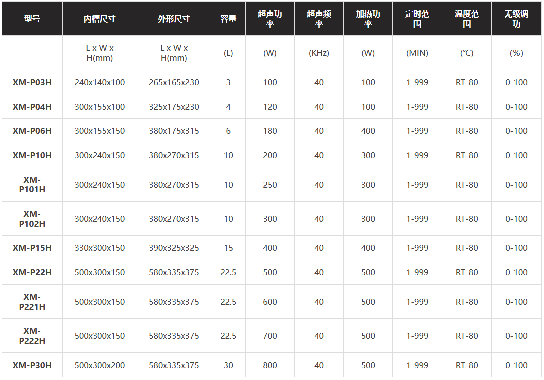 新技术具有更多性能:新一代的超声发生器采用了先进的数字电路控制方式,主要核心配件采用德国莱比信陶瓷晶片,整个仪器的运行更加稳定高效;其中XM系列超声运用我们研发的数字电路技术,我们的超声与同类产品相比更具有优势,相对于传统超声而言,我们的超声探头不易损耗,可以连续长时间的工作,亦可以空载超声;超声波换能器我们采用了与进口超声相媲美的陶瓷芯片,底座更采用散热性能更好的铝模块,使得我们的超声在三年之内超声效果的衰减度不超5%;超声调功率技术我们抛弃了传统的可控硅控制方式,我们采用了稳定性更高的固态继电器来控制超声的调功率,我们的功率变化更具线性化,在这领域内具有领先优势。中国制造,也可骄傲。
