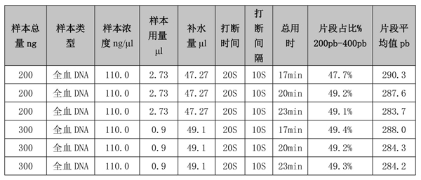 在投入量分别是200ng时,通过Qsep100片段分析仪检测,打断的DNA片段在200-400bp区间占比分别是