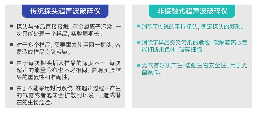 采用超声波磁致伸缩的原理,把超声波波形聚焦在液体中,使超声波能量有质的转变。传统的探头超声波破碎仪,探头与样品直接接触,一次只能处理一个样品,实验周期长;对于多个样品,需要重复使用同一探头,容易造成样品交叉污染。由于每次探头插入样品的深度不同,每次超声的能量分布也不尽相同,影响实验结果的重复性和准确性。此外,由于不能采用封闭系统,在超声过程中产生的气雾或者泡沫会扩散到环境中,造成潜在的生物危险。